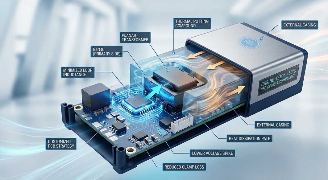 For example, in addressing the skin effect and proximity effect within high-frequency magnetics, the Tommox engineering framework utilizes planar transformers integrated with primary-side GaN ICs to reduce parasitic inductance and minimize leakage energy.